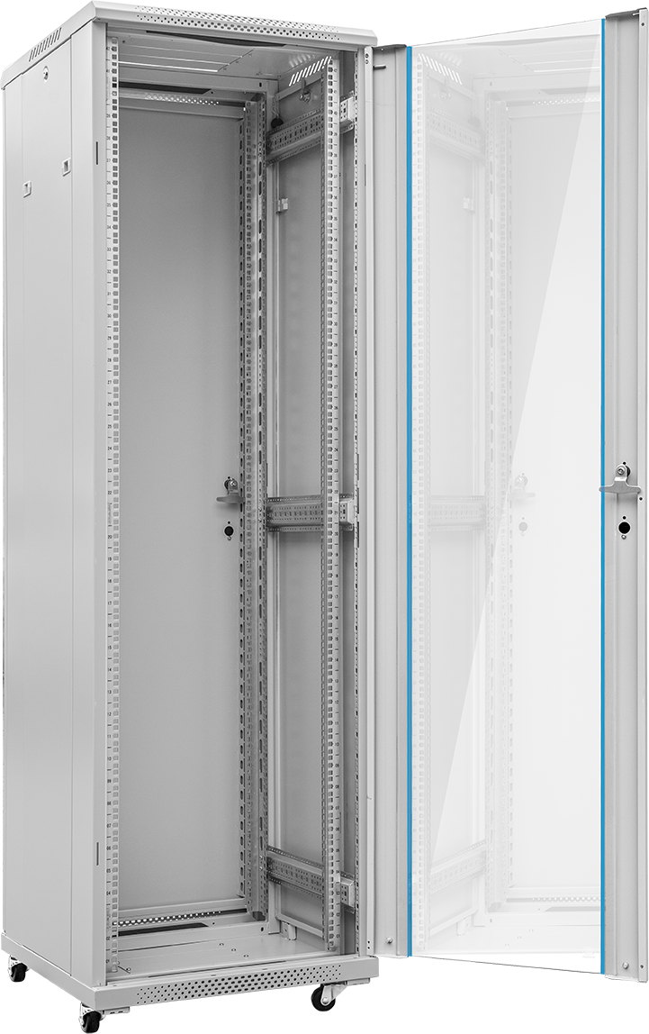 Szafy rack/teleinformatyczne: drzwi przeszklone lub metalowe pełne, gwarantujące bezpieczeństwo i estetyczny wygląd w biurach i serwerowniach.